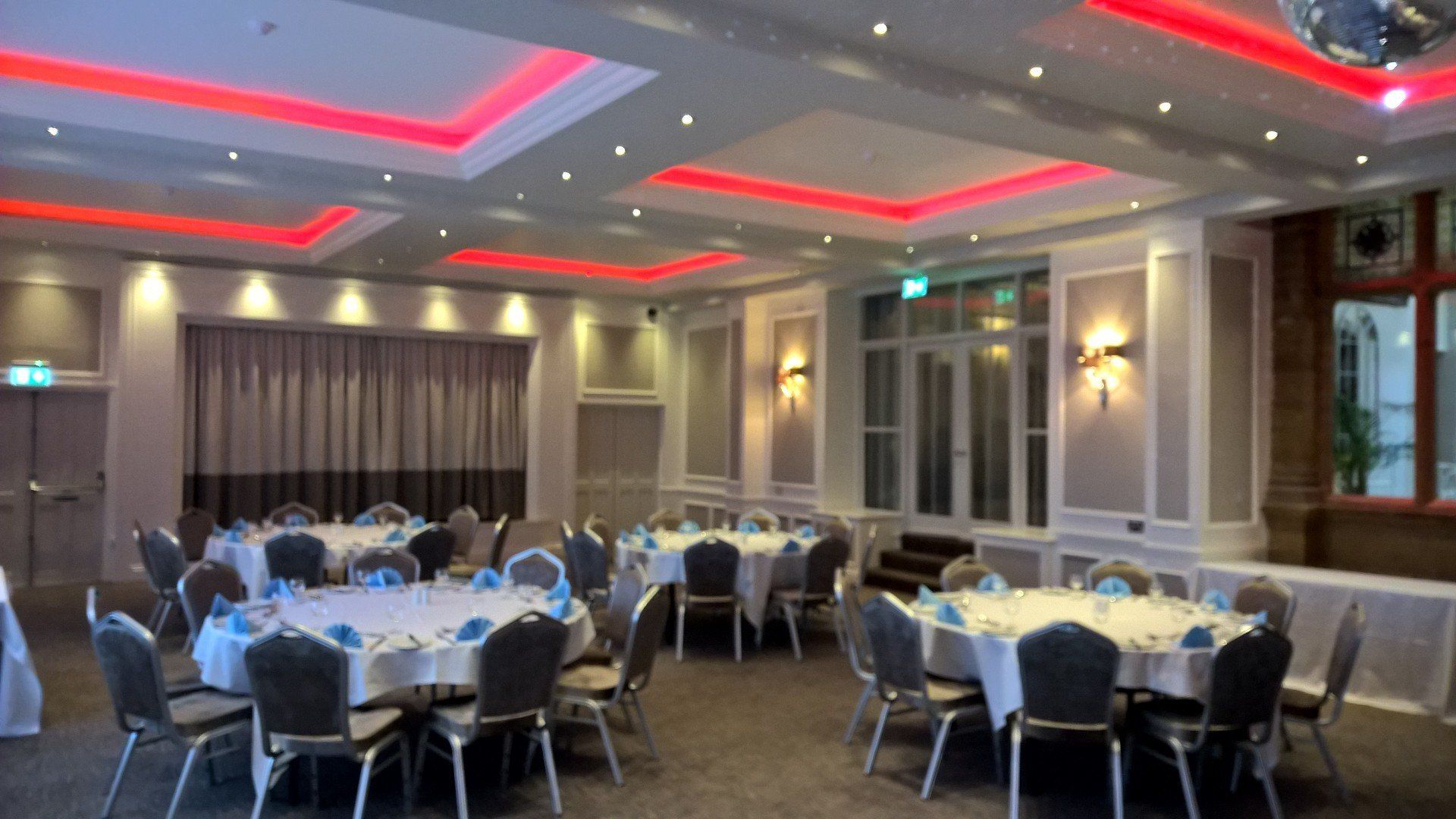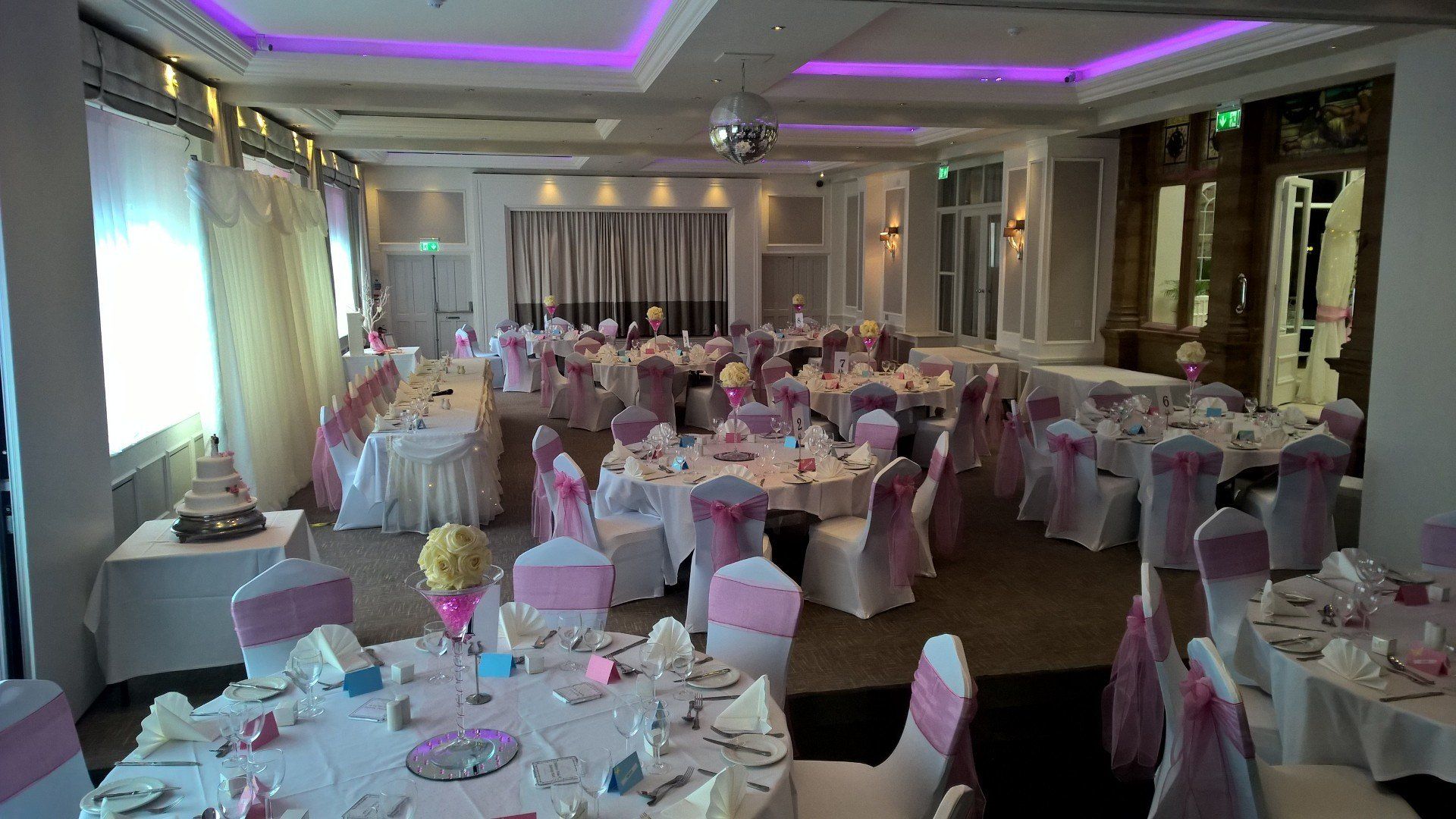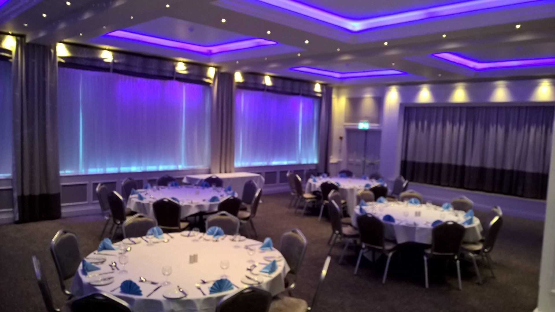 Celebrate your wedding in style with a relaxed and memorable Wedding Reception and Breakfast in our bright, elegant ballroom. Designed to host up to 150 wedding guests, our versatile event space is perfect for gathering friends and family to enjoy a delicious meal, heartfelt toasts, and a night of dancing under our state of the art lighting system and a sparkling glitter ball.